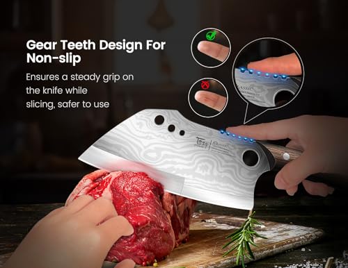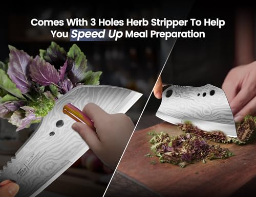 Meat Cleaver Chef Knife, 7.7 Inch Multifunction Butcher Knife With Herb Stripper And Sheath, Chinese Cleaver Heavy Duty Bone Chopper, Meat Cutting, Damascus Pattern Full Tang Wood Handle