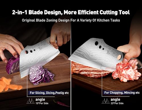 2-in-1 blade design: SYOKAMI pioneered the combination of a vegetable knife and a meat cleaver. The front half of the blade is hand-sharpened to 15° per side, which can handle various vegetables and meats; the back half of the edge is 30° per side and can easily chop bones. You only need to buy this one knife, and you can have the functions of two knives.