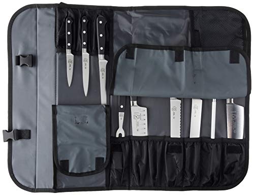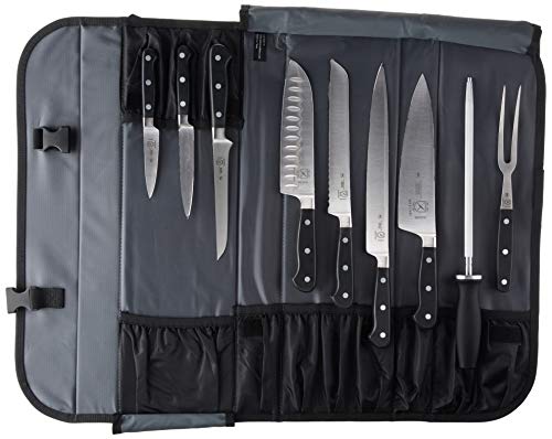 KITCHEN KNIFE SET INCLUDES: 3 1/2″ Paring Knife, 5″ Utility Knife, 6″ Stiff Boning Knife, 6″ Carving Fork, 7″ Granton Edge Santoku, 8″ Wavy Edge Bread Knife, 10″ Carving Knife, 8″ Chef’s Knife, 10″ Traditional Steel, 10-Pocket Knife Case