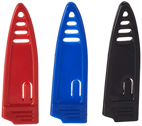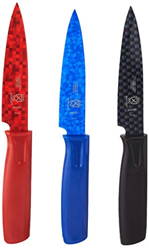 UNIQUE STYLE: A combination of beauty and brawn with attractive matrix prints on the blade that add style; Comes in a pack of 3, includes 1 each of red, blue, and black paring knives