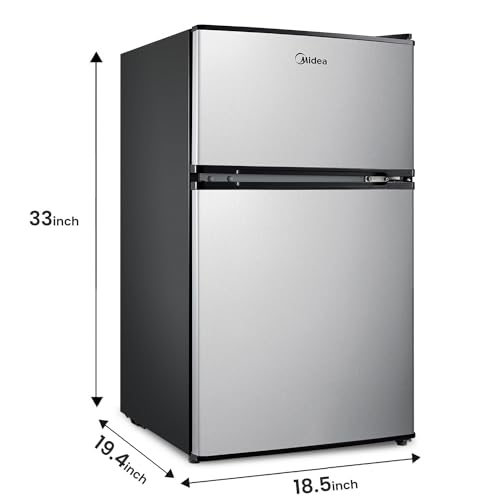Designed to operate with Energy Star efficiency, the Midea 3.1 Cu. Ft. Double Door Compact Refrigerator offers separate fridge and freezer sections with plenty of space for produce, snacks, and frozen treats. Thanks to its adjustable legs and reversible door that opens to the left or right, you can easily fit this compact fridge in any kitchen layout. Organization is made even easier with durable glass shelves, a roomy crisper drawer, and storage racks for soda cans. The mechanical temperature control lets you easily set chilling preferences, while the manual defrost setting enables hassle-free cleaning.