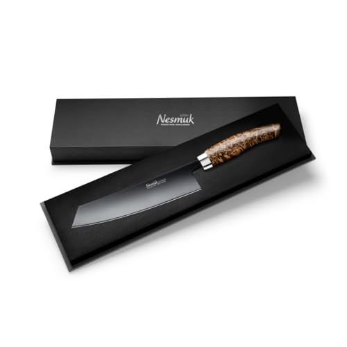 Blade: 7 Inches, niobium steel, 60 HRC, hollow grind on one side, DLC (Diamond-Like-Carbon) coating Ferrule: stainless steel matt brushed Included: high-quality matt black box, certificate of authenticity Diamond-Like Carbon – the protective shield for the blade The unmistakable hallmark of the JANUS collection is the black blade – symbol of the highest quality and functionality thanks to the finishing with the high-quality DLC technology (Diamond-Like-Carbon). As a special coating for the highest stress, it optimizes the functional properties of the blade. The carbon coating, which is only a few micrometers thick, is insensitive to acids, bases and extreme temperatures and is characterized by low friction values and enormous scratch resistance. This makes the Janus series a hand-flattering piece of work for the discerning. Sharp & resistant The outstanding cutting properties of our JANUS and SOUL collections cannot be achieved with conventional stainless steel grades. Nesmuk therefore developed a very special type of steel processing that ensures unrivaled sharpness and durability at the same time. Unusually thin-ground blades, precision craftsmanship: this is how Nesmuk creates some of the lightest and sharpest knives in the world. The Janus Chef’s Knife 180 – a high-quality chef’s knife that is a true game changer in the culinary world. With a blade measuring 7 Inches in length and 0,1 Inches in thickness, this unique chef’s knife stands out as a classic all-rounder. Engineered with a hollow grind on one side, it not only ensures versatility but also sheds an additional 30g, making it a contender for the lightest chef’s knife in the world. Featuring the classic V-grind on the cutting bevel, our Janus Chef’s Knife 180 caters to both right-handed and left-handed users seamlessly. Experience the difference and elevate your cooking with this indispensable tool in every kitchen.