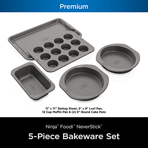 Introducing the Ninja Foodi NeverStick 5-Piece Bakeware Set, the premium bakeware that easily releases food and wipes clean. Heavy gauge 0.8mm aluminized steel minimizes rusting, resists warping, and is oven safe up to 500⁰F. The NeverStick coating easily wipes clean, is dishwasher safe, and delivers perfect results every time. This product contains Aluminum