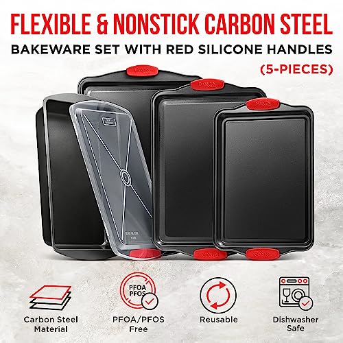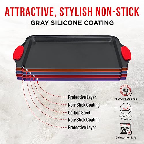 DURABLE CARBON STEEL NONSTICK COATING – Each pan features a health-safe PTFE, PFOA, PFOS-free 0.5 mm non-stick ceramic coating to ensure that even the stickiest recipes slide off the pan easily without greasing the surface, perfect to bake all your favorite cakes, brownies, cookies, and desserts without disappointing you
