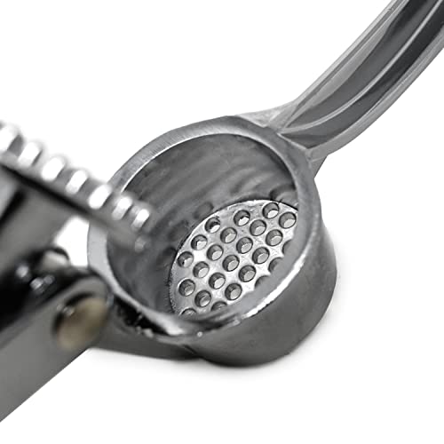 This unique design thoroughly crushes and minces an entire garlic clove with less effort. Press whole garlic cloves without the bother of peeling. Just insert the clove into the well and squeeze the handle. The peel stays in the press while the garlic is extracted from it.