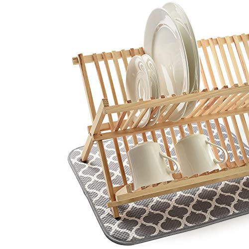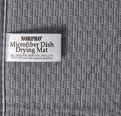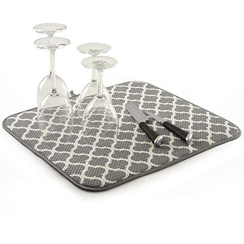 Gray color. The perfect solution for every kitchen countertop! Ideal to replace dish towels on the counter when handwashing pots, pans, dishes, glassware and cutlery! This unique design holds 4 times its weight in water by combining a thin layer of foam between two high quality, extremely absorbent, durable, microfiber layers. It’s also reversible, trellis pattern or solid gray. Dries faster than ordinary dish towels. Provides cushion for delicate dishes and stemware. Protects your counter from scratches and scuffs when placed under small appliances. Includes a sewn in hangtag to the side of the Mat, to hang up mat to dry. Can also be folded for easy storage. Measures: 18″ X 16″ X . 25″/ 45. 5cm x 40. 5cm x . 6cm