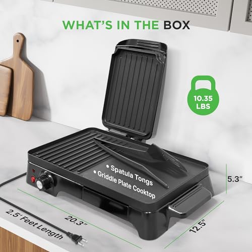 COMPACT AND SPACE SAVING: With dimensions of 20.3” x 12.5” x 5.3” and weighing only 7.92 pounds, this electric griddle is designed to fit perfectly on your countertop without taking up too much space, making it ideal for small kitchens or dorm rooms.