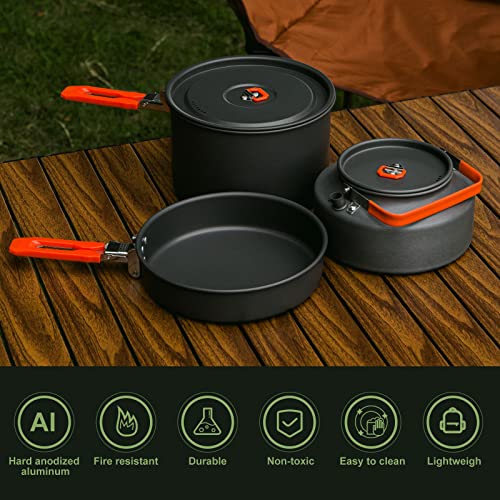 Odoland Camping Cookware Mess Kit, Camping Cooking Pot Fry Pan and 1.1L Kettle Set, Portable Camping Cookware Set with Mesh Bag for Camping, Backpacking, Outdoor Cooking and Picnic