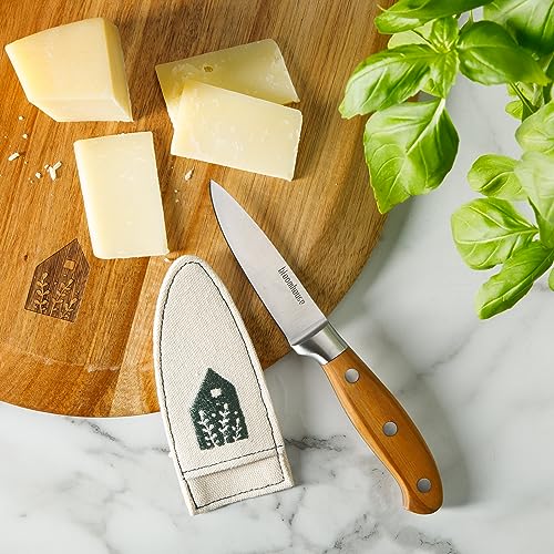 Favored in home and professional kitchens, high-quality German steel cutlery yields a variety of cuts and textures – from mincing aromatics, dicing vegetables to filleting fish and chopping prime steaks. Suitable for everyday use, a German steel knife is rust-resistant and easy to clean, sharpen and maintain. The bloomhouse™ German Steel Paring Knife is forged with a purpose – to craft bite-sized slices, garnishes and more. The full-tang blade provides balance and even weight distribution to reduce pressure and wrist fatigue. Sustainable Italian Olive Wood handle elevates the style of the knife by blending rustic design and utilitarian function. As a nod to our Earth’s beauty and resilience, the wood handle features a rustic grained pattern in a natural, golden honey-brown color to add character to the knife. Stainless steel rivets secure the handle and the knife for a strong grip and improved control. Hand wash only. Keep the knife in the protective canvas sheath for safe storage and protection when not in use.