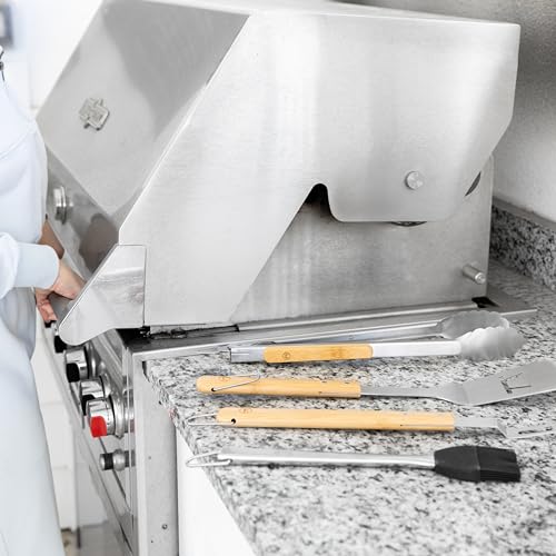 PREMIUM CONSTRUCTION: Each BBQ tool is made with durable and long lasting stainless steel. The ergonomic handles of the tongs, spatula and fork are crafted from sustainably farmed bamboo that makes them easy to handle and add to the look of the grill. The basting brush is made with flexible silicone bristles that will evenly disperse your choice of sauce.