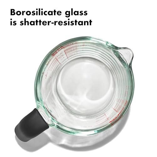 We’ve made measuring, pouring, storing, heating and reheating liquids even easier with the OXO Good Grips 2-Cup Glass Measuring Cup. Not only does it feature our bold, easy to read standard and metric measurement markings, the Cup is made of thermal shock resistant Borosilicate glass so you can take the Cup from the fridge or freezer straight to the oven or microwave without fear of it shattering. That means you can use it to reserve pasta water, heat butter or coconut oil, or reheat a batch of leftover stock or soup. The silicone non-slip handle adds an extra layer of comfort and control as it remains secure in the hand, even if it gets wet. Microwave-, fridge-, freezer- and dishwasher-safe. Also available in 1-Cup, 4-Cup and 2-Cup with lid.