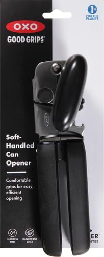 OXO International Soft Handle Can Opener The sharp cutting wheel is made of stainless steel and the handles are big and cushioned. This opener comes with a built in bottle cap opener. Model: 28081 Material: Stainless steel Color: Black handle Built in bottle cap opener Oversized knob Sharp cutting wheel Works on any size lid Height: 2″ Width: 3″ Length: 7″ 375373. Hand Wash only.