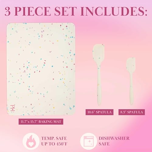 SPRINKLES ARE THE GLITTER OF BAKING: Add some glam to your baking pan with this sprinkle themed silicone baking set. Includes: 11.7- x 15.7-inch baking mat and 2 silicone spatulas.