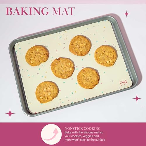 Add a dash of delight to your baked goodies with the Paris Hilton 3-Piece Sprinkles Baking Set. This cute baking set includes a reusable silicone baking mat measuring 11.7 x 15.7-inches and two sizes of spatulas. The mat distributes heat evenly up to 450°F for flawless cookies, cakes and pastries every time. Also provides easy release of baked goods and rolls up for compact storage and a reusable alternative to parchment paper. Two silicone spatulas in different sizes help with mixing, folding and decorating. All three pieces are made without BPA and are dishwasher safe for fast cleanup. Use this sprinkles baking set along with Paris’ cookie decorating kits and baking pans for treats worthy of a dessert queen.