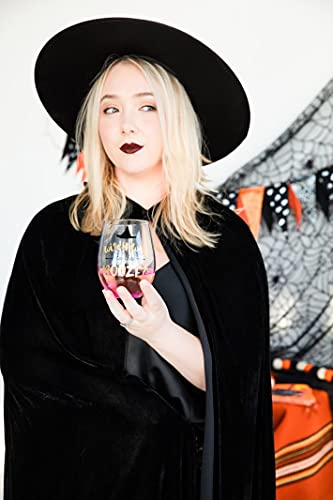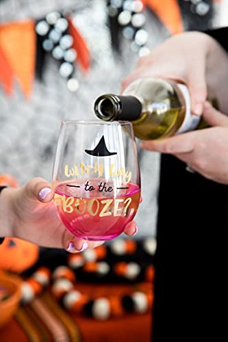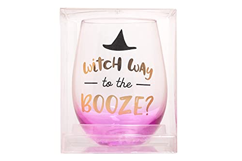 Includes one large gradient purple stemless wine glass decorated with “witch way to the booze” print under a black witch hat