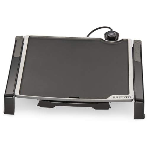 Great for every meal: breakfast, lunch, and dinner. Easily adjusts from a level cooking surface for eggs and pancakes to a tilted surface for meats. Legs fold in and drip tray locks in place for easy, compact storage. Heavy cast aluminum base with large 184-square-inch cooking surface. Premium nonstick surface ensures stick-free cooking and easy cleaning. Control Master heat control automatically maintains the desired cooking temperature. Slide-out drip tray empties easily. Easy to clean. Fully immersible with the heat control removed. Tilt to drain. Flip down the levers to tilt the grilling surface when cooking meats. Fold to store. Fits in most standard 18-inch kitchen cabinets. 120 volts AC, 1200 watts.