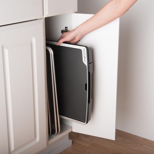 Tilt to drain. Flip down the levers to tilt the grilling surface when cooking meats. Fold to store. Fits in most standard 18-inch kitchen cabinets