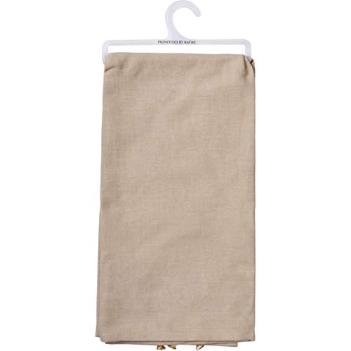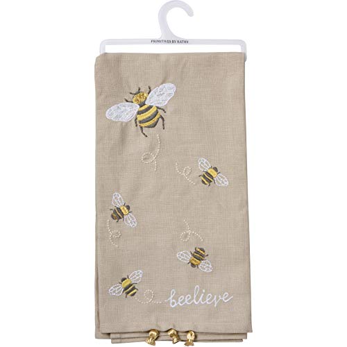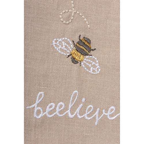 A cotton linen blend kitchen towel featuring embroidered bee designs and “Beelieve” sentiment. Features decorative tassel accents for added interest. Machine-washable.