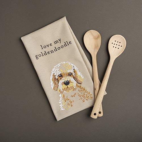 A cotton linen blend dish towel featuring a “Love My Goldendoodle” sentiment with fully embroidered goldendoodle portrait design. Machine-washable.