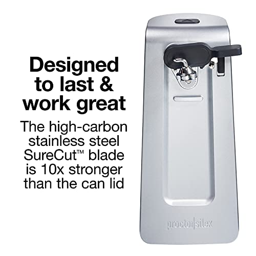 The Proctor Silex SureCut Blade Can Opener is made of durable, high-quality materials with a high-carbon stainless steel blade that’s 10x stronger than the can lid. It’s designed to open cans the first time and includes a 3 year limited warranty.
