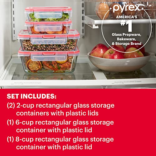 8 PIECES: In three sizes, these glass dishes are the perfect solution for organizing and storing meals, leftovers and snacks. Set includes: (2) 2-cup rectangular glass storage containers with lids, (1) 6-cup rectangular glass storage container with lid, (1) 8-cup rectangular glass storage container with lid.