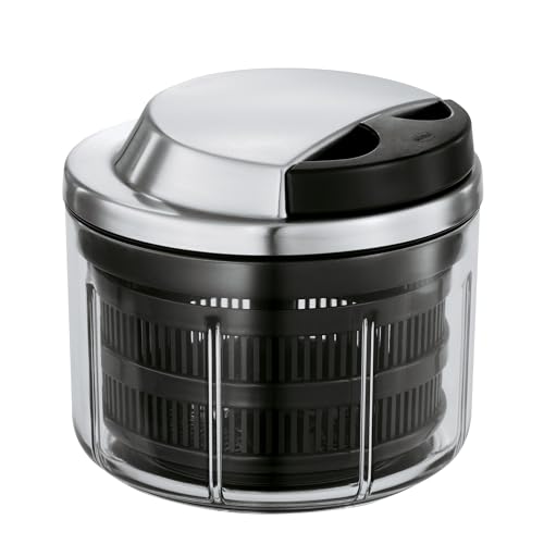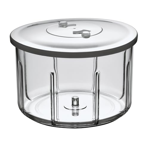 Patented cutting mechanism with two moving blades for chopping herbs, fruit and vegetables. One tug activates the patented drive mechanism which rotates the cutting blades seven times. Includes basket inset for spin-drying herbs. Ergonomic handle. Antislip material on bottom of the bowl for added convenience and safety. Lid manufactured from stainless steel.