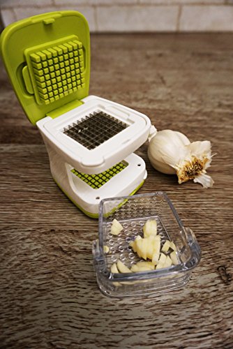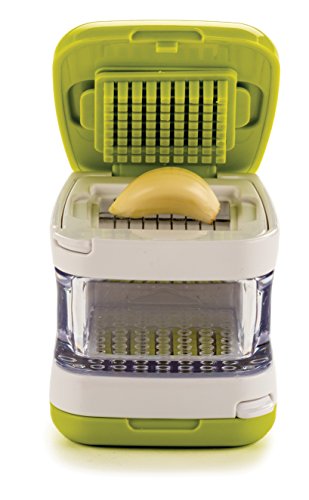 Rsvp strives to offer quality kitchen products and cooking tools at competitive prices. Our garlic cube is a perfect example. This compact gadget minces or slices peeled garlic and deposits It neatly in the clear bin. Simply open the Green lid for the mincing option, align the bin, or flip the cube and bin over for the slicing option. Parts are easy to remove for dishwasher safe cleaning. Measures 2-9/10-inches by 2-1/2-inches by 2-1/2-inches. When all the right people, and ingredients, kitchen tools, and food come together, we call this the art of gathering.