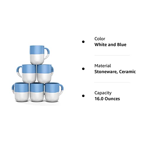 Set of 6 Large 16 Ounce Ceramic Coffee Mugs (White and Blue)