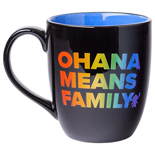COFFEE MUG: Features cute artwork of Stich accompanied by the iconic movie quote “Ohana Means Family” done in Rainbow colors, alongside a box for collectors