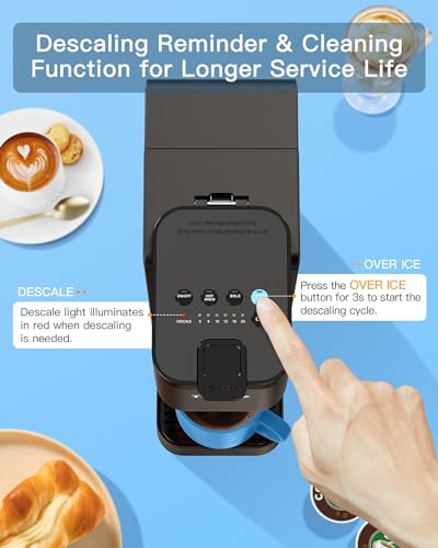 【Built-in Cleaning to Eliminate Scale Buildup】The descale indicator on this one cup coffee maker signals when cleaning is required. Easily descale by adding the solution and pressing the OVER ICE button for 3s. If the light appears during first use, press the button for 3s to reset.