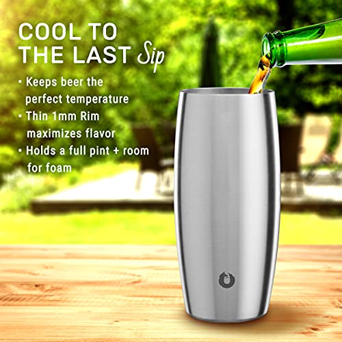 Elegance + Supreme Function: Pour an invigorating pilsner or homebrewed IPA into your new stainless steel beer glasses to experience the surprising difference in meticulously crafted double-wall drinkware. Our specialty design is unlike any pint glass, mug, or other insulated metal beer glasses you’ve tried—it’s next-level in all the right ways for true beer fans. Less than half the weight of most glass-constructed pint cups, shaped to be ergonomically friendly for hands small and large, holds a full 16-oz beer plus foam (18 oz total), and features a technologically advanced thin-rim design proven to boost drinking enjoyment. Double-walled tumblers are not all vacuum-insulated making a difference in performance. Ours are constructed with superior food-grade layers that have been permanently vacuum sealed, ensuring the outside won’t sweat or drip, while iced drinks or beer remain cold long-term inside. Your gift idea list just got easier for weddings, holidays, birthdays, and housewarmings. These world-class drink glasses will ‘wow’ recipients with every pour and sip. Liven up home parties with top-quality cocktail making accessories like our gorgeous steel glasses, shakers, and ice buckets. Rely on the beverage experts at SNOWFOX to deliver the modern looks and durability that you and your guests deserve.