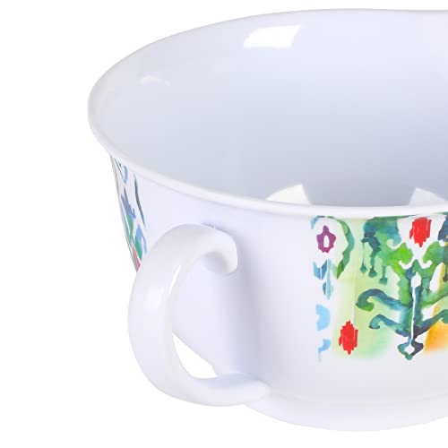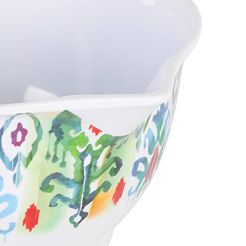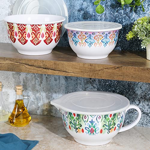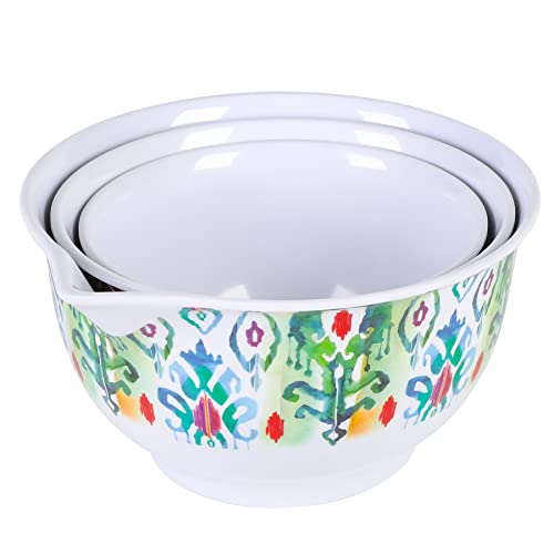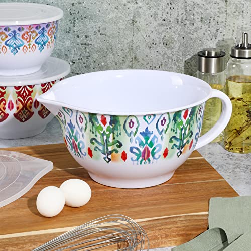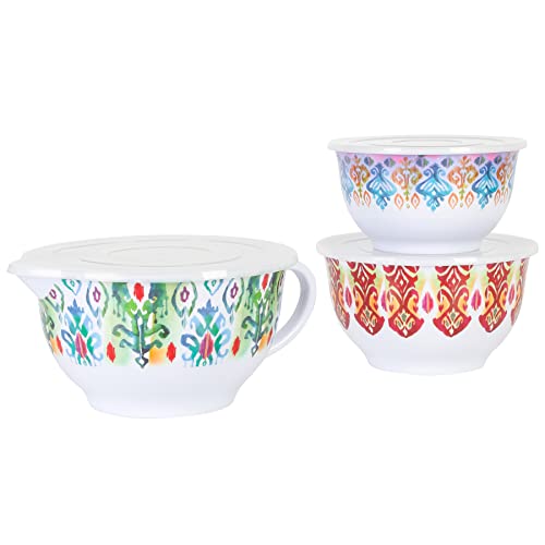 Enjoy versatility in cooking with the SPICE BY TIA MOWRY Sweet Basil 6-piece Batter Bowl Set. Made from BPA-free melamine, this set resists stains and chipping, perfect for long-lasting, everyday use. The bowls come in three different stackable sizes that nests neatly to save space in any storage. They all have secure lids that help keep the contents fresh and dry. The large bowl features a side spout for easy pouring and a sturdy handle for a safe and comfortable grip. Decorated with vibrant patterns around the exterior, each bowl is great for mixing batters, whisking eggs, or even serving nachos on game day! Every kitchen needs a versatile set of durable and fun mixing bowls to cue that exciting mealtimes are ahead. Dishwasher safe, top rack only. Do not put the bowls in the oven or microwave.