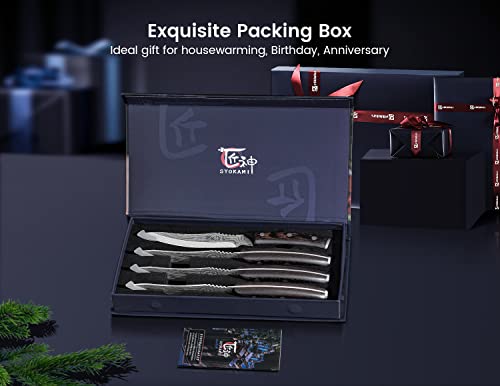 SYOKAMI steak knives are forged to HRC56+ from high quality and safe material Japanese high carbon stainless steel, hand-sharpened to a 15-degree blade angle on each side, offering excellent and durable sharpness. Non-serrated straight-edge blade allows a smooth slice on steaks and will not tear the meat fibers to lock the original flavor and nutrition of the steak.