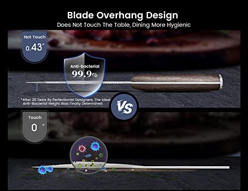Considering the ordinary steak knife in contact with the table during the meal caused by the staining health hazards and increased cleaning burden, we overturned the traditional steak knife design after 28 repeated tests and finally determined the 0.43-inch blade suspension height to ensure the health of your and your family.