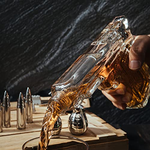 PERFECT GIFT: These Whiskey stones are an absolute must for a gift, made for all occasions, and more gorgeous in person than can be viewed online. The 750ml pistol decanter adorns this set as the main focal point for your entertaining. Perfect gift for military personnel, veterans and gun and military enthusiasts! You will be happy you gave this set as a gift.