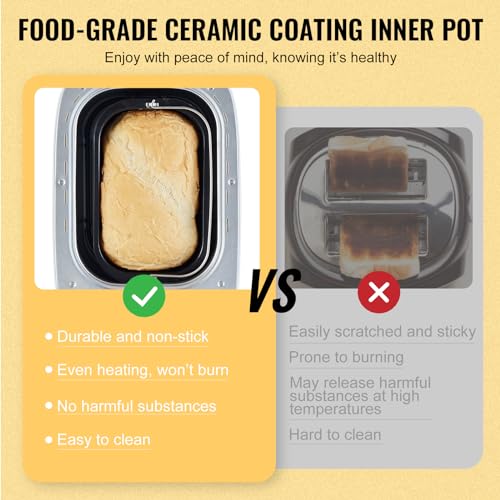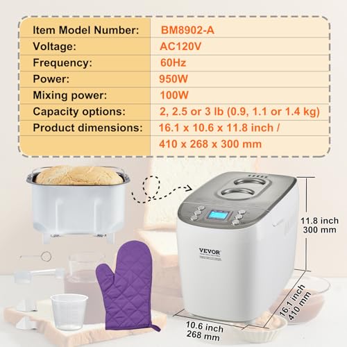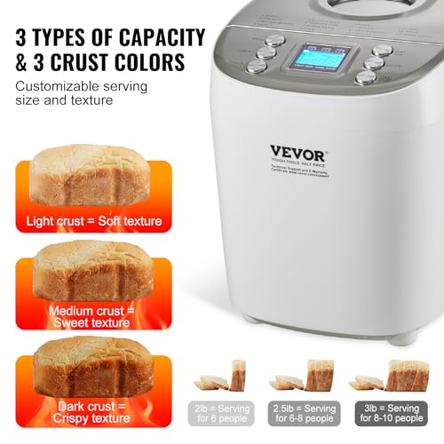 VEVOR Bread Maker, 15-in-1 3LB Dough Machine, Nonstick Ceramic Pan Automatic Breadmaker with Gluten Free Setting, Whole Wheat Bread Making, Digital, Programmable, 3 Loaf Sizes, 3 Crust Colors, White