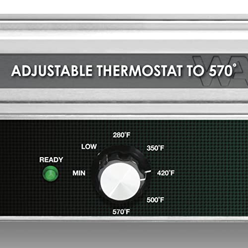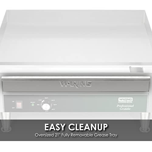 Serve up breakfast and short-order items fast and easy with the 240V Waring® WGR240X 24″ Electric Countertop Griddle. A large 24″ x 16″ grilling surface offers even heat distribution—perfect for larger items such as quesadillas, omelets and pancakes. Protect yourself from grease and spills with extra-tall splash guards and an oversized, fully removable grease tray.