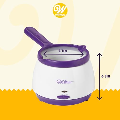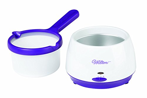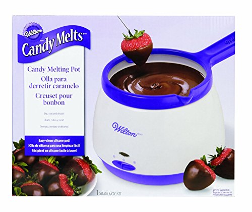 Make chocolate covered strawberries, chocolate covered pretzels, cake pops and more with the Wilton Candy Melting Pot. It features an easy-to-clean and convenient removable silicone pot with an ergonomic, heat-resistant handle and two easy-pour spouts — perfect for pouring melted candy into a decorating bag or drizzling directly onto treats. Once finished, simply chill the silicone pot until the candy hardens, then gently squeeze the soft silicone insert to pop out the remaining candy. The pot has two temperature settings, warm and melt so you can quickly melt up to 2 ½ cups of Candy Melts candy or chocolate in less than 10 minutes and keep it warm for dipping. An innovative heating base stays cool to the touch, a safety light indicates when the pot is on and it has rubber feet to keep it steady and in place on your counter. Powered by a standard 120-volt cord with polarized plug. Complete instructions included. Instructions- Wash removable silicone pot before and after each use. Be sure silicone pot is completely dry before adding candy. To preheat, place silicone pot in heating base; turn switch to Melt for 5 minutes. Use Wilton Candy Melts candy or chop melting chocolate into small pieces. Use smaller amounts for faster melting. Stir candy occasionally until completely melted. Add more candy if desired, up to MAX FILL line. When completely melted, move switch to Warm to keep candy fluid. If candy begins to cool and thicken, switch back to Melt. When finished, switch to Off and let pot cool before cleaning.