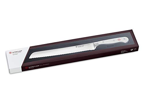 BREAD KNIFE With its unique double-serrations, the Classic White 9” Bread Knife easily glides through tough crusts while keeping the soft interior intact. This bread knife slices more cleanly and safely than knives with a traditional single-serrated edge.