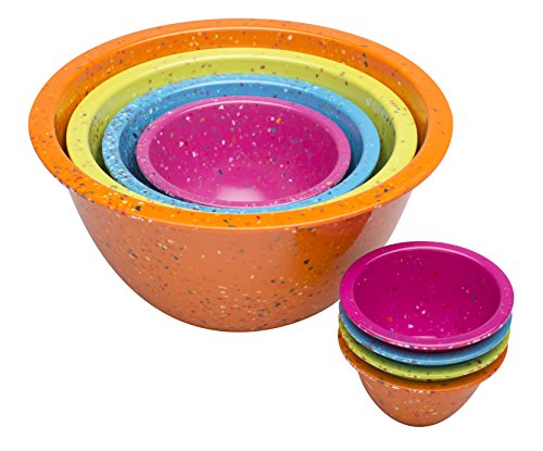 Mix it up with cheerful Confetti kitchenware! Nest to Save Space The bowl set is a vibrant statement whether used individually or nested together, and they make storage easy. These salad bowls nest together efficiently to help declutter kitchen cupboards. Great Everyday Kitchen Set This mixing bowl set contains four different sizes (4 quarts, 2. 5 quarts, 1. 25 quarts, and 18 ounces) that are suited for a variety of different situations. Aesthetic and Functional The Confetti line makes a vibrant 1950’s statement with an unmistakably modern feel, perfect for both everyday use and special occasions. Fun, inspiring colors let your creativity guide you to mix and match with everyday dinnerware and serveware. Convenient and Dishwasher Safe This premium melamine nesting bowl set is dishwasher safe to make clean-up a hassle-free affair. In addition to being easy to clean, it’s made completely BPA-free to keep you and your family that much safer as you dine. Do not use in the microwave or oven. Made of durable and melamine material. BPA-free – your family’s safety is our priority. Dishwasher safe, do not microwave. Capacity: 4 quart, 2-1/2 quart, 1-1/4 quart, and 18 ounce. Color: Assorted – Orange.