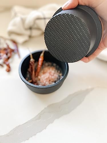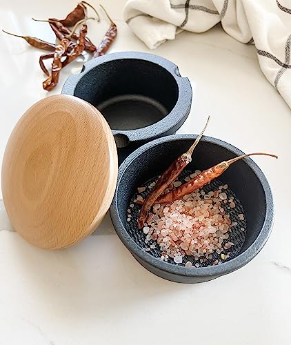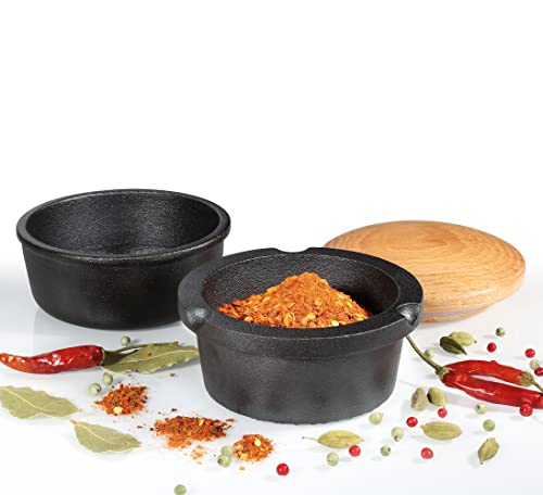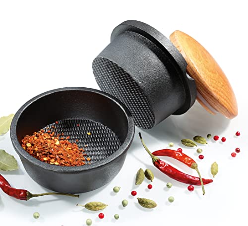 FUNCTIONAL STYLE: This attractive, functional, high quality grinding set will live permanently on your countertop because you will use it often. This manual spice grinder comes with 3 pieces: the outer cup, the inner grinder, and the lid. The bowl and grinder are made of traditional cast iron, and the lid is made of beech wood and a silicone seal to securely store ground spices, herbs, and seeds. Place herbs or spices in the cup and twist to grind, pour into the outer cup, then put the lid on top to store.